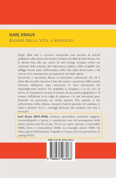 Elogio della vita a rovescio comprende una raccolta di articoli pubblicati sulla rivista Die Fackel, fondata nel 1899 da Karl Kraus, che la diresse fino alla sua morte. In essi emerge un'aspra critica nei confronti della stampa, del malcostume politico, della stupidità che affligge buona parte dell'umanità, della crisi della democrazia e del caos in cui è miseramente precipitata la vita dello spirito. Irriverente e sarcastico, Kraus, in particolare nell'articolo che dà il titolo alla raccolta, descrive il lato più misero e grottesco della società viennese dell'epoca, vista attraverso le lenti deformanti del capovolgimento ironico: "La stupidità si assopisce e io mi reco al lavoro. In lontananza avverto il rumore di una pressa tipografica: è il russare dell'idiozia. Io la colgo di sorpresa e le mie intenzioni poco benevole mi procurano un sottile piacere. Poi, quando a est, sull'orizzonte della cultura, compare il primo giornale del mattino, io vado a dormire. Ecco i vantaggi derivanti dal condurre una vita a rovescio".