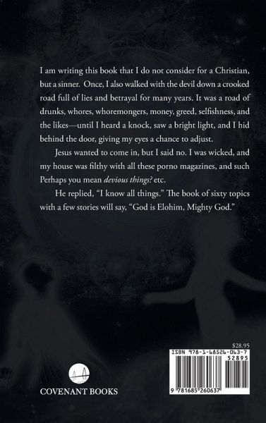 I in writing this book that I do not consider for a Christian, but a sinner. Once, I also walked with the devil down a crooked road full of lies and betrayal for many years. It was a road of drunks, whores, whoremongers, money, greed, selfishness, and the likes-until I heard a knock, saw a bright light, and I hid behind the door, giving my eyes a chance to adjust.Jesus wanted to come in, but I said no. I was wicked, and my house was filthy with all these porno magazines, and such devious things etc.He replied, "I know all things." The book of sixty topics with a few stories will say, "God is Elohim, Mighty God."