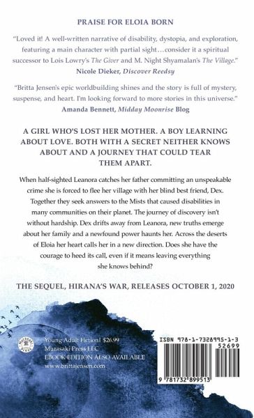 "Loved it! A well-written narrative of disability, dystopia, and exploration...consider it a spiritual successor to Lois Lowry's The Giver and M. Night Shyamalan's The Village."--Nicole Dieker, Discovery Reedsy "Britta Jensen's epic worldbuilding shines and the story is full of mystery, suspense, and heart. I'm looking forward to more stories in this universe."--Amanda Bennett, Midday Moonrise Blog Winner of the Writer's League of Texas 2019 YA Discovery Prize! A girl who's lost her mother. A boy learning about love. Both with a secret neither knows about and a journey that could tear them apart. When half-sighted Leanora catches her father committing an unspeakable crime she is forced to flee her village with her blind best friend, Dex. Together they seek answers to the Mists that caused disabilities in many communities on their planet. The journey of discovery isn't without hardship. Dex drifts away from Leanora, new truths emerge about her family and a newfound power haunts her. Across the deserts of Eloia her heart calls her in a new direction. Does she have the courage to heed its call, even if it means leaving everything she knows behind?The sequel, Hirana's War, releases October 1, 2020.