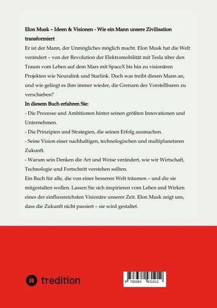 "Elon Musk - Ideen & Visionen - Wie ein Mann unsere Zivilisation transformiert"Begleiten Sie mich in die faszinierende Welt eines Mannes, der unsere Gegenwart prägt wie kein Zweiter und die Zukunft für unsere Zivilisation neu definiert! Elon Musk, der visionäre Unternehmer hinter Tesla, SpaceX, Neuralink und Starlink, steht wie kein anderer für bahnbrechende Innovationen und mutige Ideen. Dieses Buch beleuchtet nicht nur die Meilensteine seines Schaffens und seiner Unternehmen, sondern auch die tiefere Philosophie und seine Prämissen, die ihn antreiben: eine nachhaltige, technologisch fortschrittliche und multiplanetare Zivilisation.Erfahren Sie:Wie Elon Musk den Weg für Elektromobilität und erneuerbare Energien ebnete.Warum er davon überzeugt ist, dass die Menschheit den Mars besiedeln muss.Welche Strategien ihn trotz scheinbar unüberwindbarer Hindernisse zum Erfolg führten.Welche Lektionen Sie aus seinem Führungsstil und seiner Denkweise ziehen können.Dieses Buch ist mehr als nur eine Biografie - es ist eine Inspirationsquelle für Innovatoren, Unternehmer und alle, die die Grenzen des Möglichen verschieben wollen. Lassen Sie sich mitreißen von Musks unermüdlichem Pioniergeist und seiner Vision einer besseren Welt.Hermann Selchow