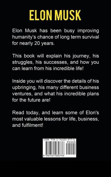 ELON MUSK Elon Musk has been busy improving humanity’s chance of long term survival for nearly 20 years. After helping to form PayPal, Musk went on to form a company whose work has since replaced the space shuttle when it comes to NASA flights to the space station and is behind the recent expansion in the number of electric cars on the road as well. In addition to being a compelling story of triumphing against adversity, 'Elon Musk: Best Lessons for Life, Business, Success and Entrepreneurship!' has plenty to teach when it comes to learning the lessons that Musk has taken to heart to achieve his success. Musk is a symbol of the American dream, despite not being American, he is truly self-made, working his way through college and starting his first business in time to take advantage of the burgeoning internet scene to become a millionaire before the age of 30. Unlike many people who might think that was enough, Musk instead put his money into another startup which quintupled his net worth when his company was purchased by eBay. From there he went on to become the CEO of two companies which are each worth $1 billion. Do yourself a favor, learn from what Musk has done, and read this book today. Here Is What You'll Learn About... Who Is Elon Musk What Makes Elon So Successful Elon's Biggest Successes Elon's Biggest Failures What Elon Has Planned For The Future Lessons You Can Learn From Elon Musk How To Replicate Elon's Success Much, Much More!