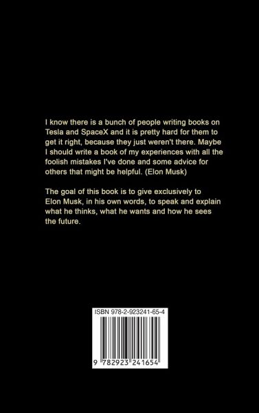 About writing about him and his companies, Elon Musk said: I know there is a bunch of people writing books on Tesla and SpaceX and it is pretty hard for them to get it right, because they just weren't there. Maybe I should write a book of my experiences with all the foolish mistakes I've done and some advice for others that might be helpful. ¿He attacks on the world bests settled markets, as the automotive industry, Elon had declared: we createdTesla to make a difference in the world. Disruption at its best, pushing his competitors forward, expanding and leading technology. Elon is always thinking about the future of making things work better, more efficient, a visionary man who never gives up. Although there would have been a few moments when giving up would have been a more than plausible option, he never did. He once said: I don't ever give up, I mean I'd have to be dead or completely incapacitated. The goal of this book is to give exclusively to Elon Musk, in his own words, to speak and explain what he thinks, what he wants and how he sees the future. By listening to him speak and trying to explain his views and ideas, I discovered a man with a sincere goal to change the world and make it a better place. He is not only very intelligent, an excellent businessman, but also very modest and sincere.