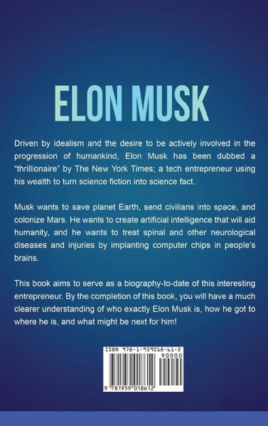 ELON MUSK Driven by idealism and the desire to be actively involved in the progression of humankind, Elon Musk has been dubbed a "thrillionaire" by The New York Times; a tech entrepreneur using his wealth to turn science fiction into science fact. Musk wants to save planet Earth, send civilians into space, and colonize Mars. He wants to create artificial intelligence that will aid humanity, and he wants to treat spinal and other neurological diseases and injuries by implanting computer chips in people's brains. This book aims to serve as a biography-to-date of this interesting entrepreneur. By the completion of this book, you will have a much clearer understanding of who exactly Elon Musk is, how he got to where he is, and what might be next for him!