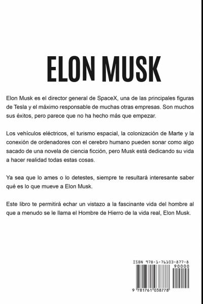 ELON MUSK Presentamos una completa biografía de una de las personalidades más enigmáticas y fascinantes de nuestro tiempo: Elon Musk. Desde sus humildes comienzos en Sudáfrica hasta su estatus como uno de los empresarios más exitosos de la era moderna, este libro profundiza en la vida y la mente de Elon Musk, revelando la increíble historia de su ascenso a la fama y la fortuna. Esta biografía explora la infancia de Musk, su educación poco convencional y sus primeras aventuras empresariales. Profundiza en su papel como cofundador de PayPal, su trabajo pionero en coches eléctricos con Tesla y sus ambiciosos planes para colonizar Marte con SpaceX. Y lo que es más importante, esta biografía mira hacia el futuro, examinando qué podría ser lo próximo para Elon Musk y sus numerosas empresas. Tanto si es un fan de la obra de Musk como si simplemente siente curiosidad por una de las personas más fascinantes de nuestro tiempo, este libro es una lectura esencial. Con una narración apasionante y un análisis perspicaz, esta biografía es una lectura obligada para cualquier persona interesada en la vida y la época de Elon Musk. ¡Consigue hoy mismo tu ejemplar y descubre la extraordinaria historia de este empresario visionario!