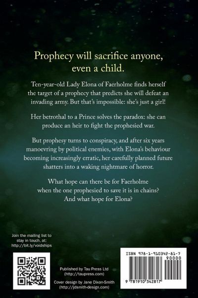 Prophecy will sacrifice anyone, even a child. Ten-year-old Lady Elona of Faerholme finds herself the target of a prophecy that predicts she will defeat an invading army. But that’s impossible: she's just a girl! Her betrothal to a Prince solves the paradox: she can produce an heir to fight the prophesied war. But prophesy turns to conspiracy, and after six years manoevring by political enemies, with Elona's behaviour becoming increasingly erratic, her carefully planned future shatters into a waking nightmare of horror. What hope can there be for Faerholme when the one prophesied to save it is in chains? And what hope for Elona?