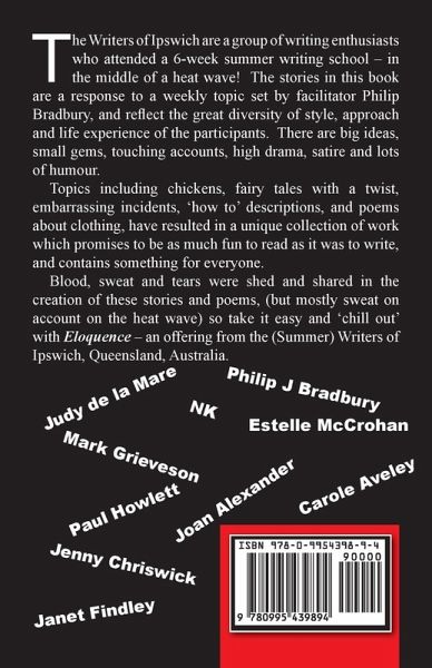 The Writers of Ipswich are a group of writing enthusiasts who attended a 6-week summer writing school – in the middle of a heat wave! The stories in this book are a response to a weekly topic set by facilitator Philip Bradbury, and reflect the great diversity of style, approach and life experience of the participants. There are big ideas, small gems, touching accounts, high drama, satire and lots of humour. Topics including chickens, fairy tales with a twist, embarrassing incidents, ‘how to’ descriptions, and poems about clothing, have resulted in a unique collection of work which promises to be as much fun to read as it was to write, and contains something for everyone. Blood, sweat and tears were shed and shared in the creation of these stories and poems, (but mostly sweat on account on the heat wave) so take it easy and ‘chill out’ with Eloquence – an offering from the (Summer) Writers of Ipswich, Queensland, Australia.