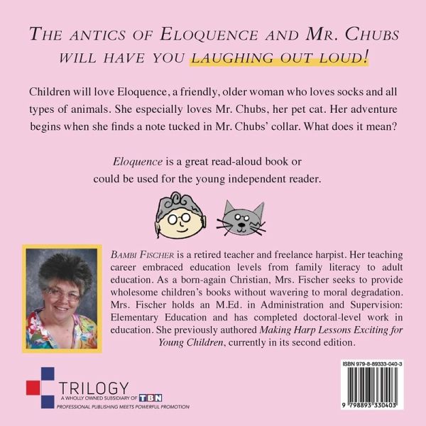 The antics of Eloquence and Mr. Chubs will have you laughing out loud! Children will love Eloquence, a friendly, older woman who loves socks and all types of animals. She especially loves Mr. Chubs, her pet cat. Her adventure begins when she finds a note tucked in Mr. Chubs' collar. What does it mean? Eloquence is a great read-aloud book or could be used for the young independent reader.