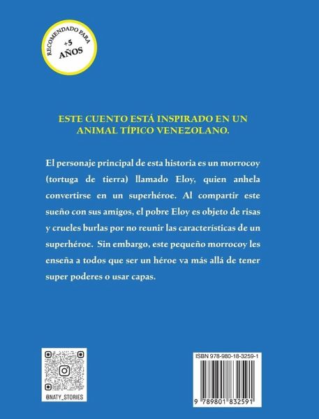 Esta obra ha sido reconocida por los International Latino Book Awards 2023 con una Mención de honor como el "Mejor libro inspiracional ilustrado para niños." El personaje principal de esta historia es un morrocoy (tortuga de tierra) llamado Eloy, quien anhela convertirse en un super héroe. Al compartir este sueño con sus amigos, el pobre Eloy es objeto de risas y crueles burlas por no reunir las características de un super héroe. Sin embargo, este pequeño morrocoy les enseña a todos que ser un héroe va más allá de tener super poderes o usar capas. This book has been recognized by the International Latino Book Awards 2023 with a Honorable mention as the "Best illustrated inspirational book for children in Spanish." The main character of this story is a morrocoy (land turtle) named Eloy, who longs to become a superhero. When sharing this dream with his friends, poor Eloy is the object of laughter and cruel ridicule for not having the stereotypical characteristics of a superhero. However, this little morrocoy teaches everyone that being a hero goes beyond having superpowers or wearing capes.