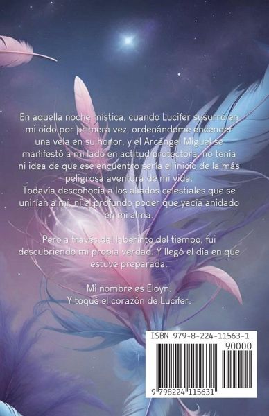 ¡Esta novela de fantasía espiritual invita al lector a un viaje de crecimiento personal y expansión de conciencia! En aquella noche mística, cuando Lucifer susurró en mi oído por primera vez, ordenándome encender una vela en su honor, y el Arcángel Miguel se manifestó a mi lado en actitud protectora, no tenía ni idea de que ese encuentro sería el inicio de la más peligrosa aventura de mi vida. Todavía desconocía a los aliados celestiales que se unirían a mí, ni el profundo poder que yacía anidado en mi alma. Pero a través del laberinto del tiempo, fui descubriendo mi propia verdad. Y llegó el día en que estuve preparada. Mi nombre es Eloyn. Y toqué el corazón de Lucifer. TOMA NOTA: Este relato va más allá de los límites de la fantasía convencional. Se fundamenta en experiencias sobrenaturales reales y está dirigido a aquellos en búsqueda de un camino hacia su espiritualidad, ansiando inspiración de algo infinitamente mayor.