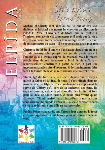 Elpida, tome 3 Michael et Christy sont allés au bal, ils ont obtenu leur diplôme, et Michael a remporté les épreuves de sélection de l'USATF. Avec l'Université d'Oxford qui se profile à l'horizon, son avenir est prometteur et il croit que la vie a repris son cours normal après le sauvetage de Christy d'un de ses agresseurs du passé - il ne pourrait pas avoir plus tort. Christy a été libéré d'une vie d'esclavage depuis un an et a fait de remarquables progrès, en grande partie grâce à l'amour qu'il a trouvé auprès de Michael. Mais le récent procès d'un de ses bourreaux a brisé la vie qu'il a si laborieusement construite à partir de rien, à part une incommensurable suite d'horreurs. Il doit maintenant faire face à la lourde tâche de se reconstruire une nouvelle fois. Thimi, âgé de douze ans, a disparu depuis que Christy a quitté la Grèce et, à l'insu de tous, il s'est réfugié dans un manoir vide de Glyfada. C'est seulement en apprenant la survie de Christy qu'il sort de sa cachette. Les gens, les espaces ouverts, même le plus anodin des bruits lui font peur au-delà de toute raison. À peine plus vivant qu'un fantôme, Thimi arrive aux États-Unis sans aucune connaissance du monde extérieur - la seule constante dans sa vie se réduisant à une bille en marbre violet. Perdus, brisés et apeurés, seul l'espoir leur donnera la force et le courage dont ils ont besoin pour recommencer leurs vies.
