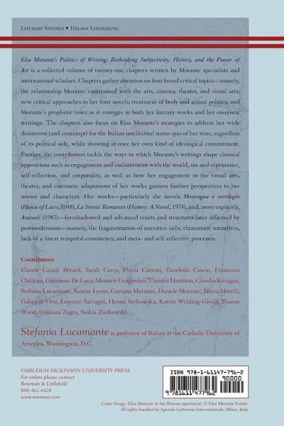Introduction, Stefania Lucamante Chapter 1: Daniele Morante: "Elsa Morante's Correspondence: A New Source for the Artist's Biography" Chapter 2: Giuliana Zagra: "Writing: A Lifelong Affair. Notes from the Elsa Morante Archives" Part One: New Approaches to Morante's Oeuvre Chapter 3: Francesco Chillemi: "In the Realm of the Lie: The Implosion of Thought and the Monsters of Reason in Menzogna e Sortilegio" Chapter 4: Saskia Ziolkowski: "Morante and Kafka: The Gothic Walking Dead and Talking Animals" Chapter 5: Sarah Carey: "Elsa Morante: Envisioning History" Chapter 6: Sharon Wood: "Excursus as Narrative Technique in La Storia" Chapter 7: Stefania Lucamante: "'The World Must Be the Writer's Concern': Elsa Morante's Visions of History" Chapter 8: Lorenzo Salvagni: "In Marguerite Caetani's Literary Salon: a Study of Elsa Morante's Contributions to Botteghe Oscure" Part Two: Theater, Visual Arts and Cinema Chapter 9: Gabrielle Orsi: "Lo Scialle Andaluso: The Intimate Theater of Elsa Morante" Chapte