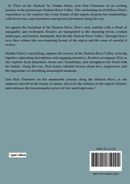 " In "Elsie on the Hudson" by Martha Finley, join Elsie Dinsmore on an exciting journey to the picturesque Hudson River Valley. This enchanting novel follows Elsie's experiences as she explores the scenic beauty of the region, deepens her relationships with loved ones, and encounters unexpected adventures along the way. Set against the backdrop of the Hudson River, Elsie's story unfolds with a blend of tranquility and excitement. Readers are transported to the charming towns, verdant landscapes, and historic landmarks that dot the Hudson River Valley. Through Elsie's eyes, they witness the awe-inspiring beauty of the region and the sense of serenity it evokes. Martha Finley's storytelling captures the essence of the Hudson River Valley, weaving together captivating descriptions and engaging narratives. Readers accompany Elsie as she explores local attractions, forms new friendships, and strengthens her bond with her family. Along the way, Elsie learns valuable lessons about love, forgiveness, and the importance of cherishing meaningful moments. Join Elsie Dinsmore on her memorable journey along the Hudson River, as she immerses herself in the beauty of nature, discovers the richness of the region's history, and embraces the transformative power of love and forgiveness."