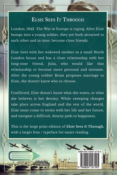 London, 1943. The War in Europe is raging. After Elsie bumps into a young soldier, they are both attracted to each other and in time, become close friends. Elsie lives with her widowed mother in a small North London house and has a close relationship with her long-time friend, Julia, who would like that relationship to become more personal and intimate. After the young soldier Brian proposes marriage to Elsie, she doesn't know who to choose. Conflicted, Elsie doesn't know what she wants, or what she believes is her destiny. While sweeping changes take place across England and the rest of the world, Elsie must come to terms with her life and her future, and navigate a difficult, thorny path to happiness. This is the large print edition of Elsie Sees It Through, with a larger font / typeface for easier reading.