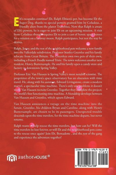 Elt's escapades continue! Elt, Ralph Eltison's pet, has become Elt the Super Dog, thanks to special powers granted him by Coladeus, a friendly alien from the planet Trianthius. Now that Ralph is aware of Elt's powers, he is eager to join Elt on an upcoming mission. A visit from Coladeus though requires Elt to join a cast of heroic space heroes for a mission on a faraway moon. Ralph participates, but not the way he desires. Ralph, Jenny, and the rest of the neighborhood pets welcome a new family into the Valleydale subdivision. Professor Stanley Greenlee and his family relocate from Great Britain. The Greenlees own two pets of their own, including a French Poodle named Trixie. The town welcomes another new resident, Henry Buttersample. He and his family open a candy store and factory in downtown Spring Valley. Professor Eric Van Hausen is Spring Valley's most notable scientist. The proprietor of the town's space observatory has an obsession with time travel. He, along with his assistant, Edward Livingstone, create a modern marvel, a spectacular time machine. There's only one problem; it doesn't work. Van Hausen recruits Greenlee. Together they complete the project; the world's first functioning time machine. A friendship develops between Van Hausen and Greenlee, which upsets Edward. Van Hausen announces a voyage on the time machine into the future. Greenlee, his children Bryan and Caroline, along with Henry Buttersample, are chosen to be its passengers. Unexpected trouble descends upon the time travelers, for the time machine departs, but never returns. Ralph wants to help rescue the time travelers, but how can he? Will the time travelers be lost forever, or will Elt and the neighborhood pets come to the rescue once again? Join Elt, Bernadette , and the rest of the gang and experience the adventure together!
