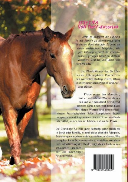 Erziehung ist eine lebendige Herausforderung für Eltern.Ebenso lebendig ist die Art und Weise, wie die Pferde den Eltern vermitteln, worauf es eigentlich ankommt.Eltern suchen nach Orientierung für die schwierige Aufgabe, die Kinder zu erziehen. Damit sind sie heute so gut wie auf sich allein gestellt, denn einheitliche Vorstellungen von Erziehung, so wie sie noch vor 50 Jahren vorhanden waren, gibt es nicht mehr. Pferde als wahre Meister der sozialen Kompetenzen und der Körpersprache bieten hier eine ganze Palette an Möglichkeiten, genau diese Orientierung zu finden und zu vermitteln. Pferde sind unbestechlich, absichtslos und authentisch. Somit durchschauen sie die Taktik und die Mechanismen unserer Handlungen und können uns unsere inneren Wirkmechanismen erfahrbar und bewusst machen. Das ist eine Chance, sich selbst besser kennen zu lernen.Pferde spiegeln den Menschen. Das nutze ich heute für meine vielfältige Arbeit mit Eltern, Erziehern und Lehrern, um nach Lösungen zu suchen, wie sie mit den ihnen anvertrauten Kindern vertrauensvoll und kompetent umgehen können. Meine Arbeit beschäftigt sich mit den "Glaubenssätzen". Die Pferde schaffen es, unsere Glaubenssätze und Lebensphilosophien, die seit der Kindheit tief in uns eingeprägt sind, wieder an die Oberfläche zu holen. So werden die eigenen Ängste und ungelebten Wünsche erfahrbar und auch spürbar und können von den Personen bearbeitet und verändert werden.Ich freue mich auf jede Stunde dieser schönen Arbeit, denn ich bin in der hier die Moderatorin, die eigentliche Arbeit machen die Pferde. Und Pferde sind wundervolle Trainer.Auch wenn Sie kein Pferd "zur Hand" haben, werden Sie vieles in dem Buch "Eltern sind Führungskräfte" entdecken, was Sie gern schon viel früher gewusst hätten.