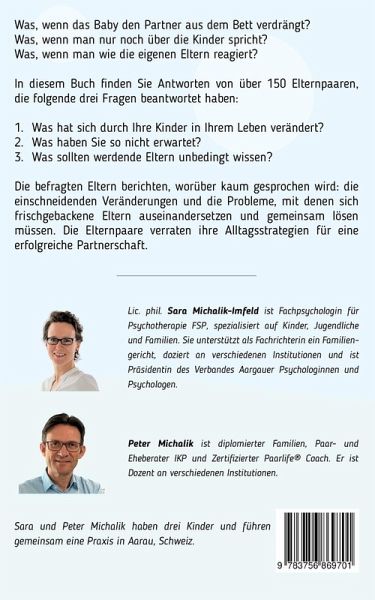 Was, wenn das Baby den Partner aus dem Bett verdrängt? Was, wenn man nur noch über die Kinder spricht? Was, wenn man wie die eigenen Eltern reagiert? In diesem Buch finden Sie Antworten von über 150 Elternpaaren, die folgende drei Fragen beantwortet haben:1. Was hat sich durch Ihre Kinder in Ihrem Leben / Partnerschaft verändert?2. Was haben Sie so nicht erwartet?3. Was sollten werdende Eltern Ihrer Meinung nach unbedingt wissen?Die Eltern berichten, worüber kaum gesprochen wird: die einschneidenden Veränderungen und die Probleme, mit denen sich frischgebackene Eltern auseinandersetzen und gemeinsam lösen müssen. Die Elternpaare verraten ihre Alltagsstrategien für eine erfolgreiche Partnerschaft.