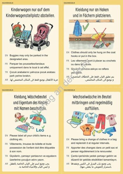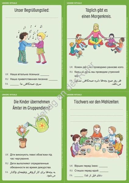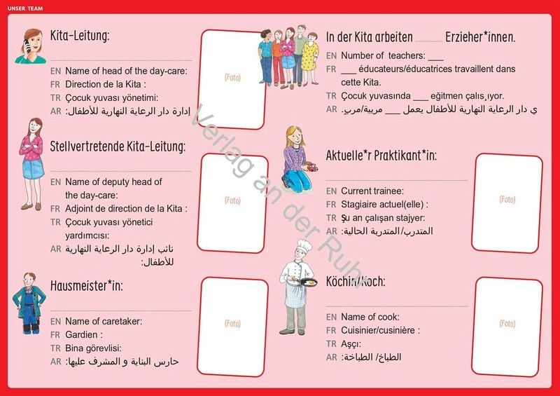 Mehrsprachige Bildkarten für multikulturelle Elterngespräche in der Kita +++ Die (Sprachen-)Vielfalt in der Kita stellt Erzieher und Erzieherinnen im Alltag regelmäßig vor besondere Herausforderungen in der Elternkommunikation: Wie führt man ein Elterngespräch, wenn es keine gemeinsame Sprache zur Verständigung gibt und auch kein Dolmetscher und keine Dolmetscherin einbezogen werden können? Wo Worte fehlen, helfen Bilder - dies ist die Idee dieser mehrsprachig übersetzten Bildkarten, die Sie in Elterngesprächen mit nicht deutschsprachigen Eltern als visualisierte Verständigungshilfe einsetzen können. Abgestimmt auf die Themeninhalte von Entwicklungs- und Kennenlerngesprächen, bietet Ihnen dieses Material Bildvorlagen mit Textbausteinen in den Sprachen Türkisch, Arabisch, Englisch und Französisch. Darüber hinaus finden Sie im Kartenset auch wichtige Themen aus dem Kita-Alltag, wie Tagesablauf, Hausregeln, Rituale, Festlichkeiten im Kita-Jahr, sowie Empfehlungen für eine gelingendeErziehungspartnerschaft. Didaktische Tipps zum praktischen Einsatz der Karten, eine Liste relevanter Sätze in den verschiedenen Sprachen für das Drumherum eines herzlichen Gesprächs sowie nützliche Hintergrundinformationen zu Kultur und Kita-System der Herkunftsländer finden Sie in einem umfangreichen Begleitheft.