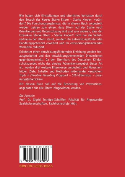 Konzept und Forschungsergebnisse des Elternkurses Starke Eltern - Starke Kinder® werden präsentiert, entwicklungshemmende und entwicklungsfördernde Dimensionen der Erziehung aufgezeigt, drei weitere Elternkurse miteinander verglichen: Triple P, Step, Erziehungsführerschein. Wie haben sich Einstellungen und elterliches Verhalten durch den Besuch des Kurses Starke Eltern - Starke Kinder® verändert? Die Forschungsergebnisse, die in diesem Buch vorgestellt werden, zeigen zu meinen, dass Eltern auf der Suche nach Orientierung und Unterstützung sind und zum anderen, dass der Elternkurs Starke Eltern - Starke Kinder® nicht nur das Selbstvertrauen der Eltern stärkt, sondern ihr entwicklungsförderndes Handlungspotenzial erweitert und ihr entwicklungshemmendes Verhalten reduziert. Eckpfeiler einer entwicklungsfördernden Erziehung werden herausgearbeitet und den entwicklungshemmenden Dimensionen gegenübergestellt. Da der Elternkurs des Deutschen Kinderschutzbundes nicht das einzige Präventionsangebot dieser Art ist, werden drei weitere Elternkurse vorgestellt und Menschenbilder, Ziele, Inhalte und Methoden miteinanderverglichen: Triple P (Positive Parenting Program) - STEP-Elternkurs - Erziehungsführerschein. Mit diesem Buch soll auf die Bedeutung von Präventionsangeboten für alle Eltern hingewiesen werden.