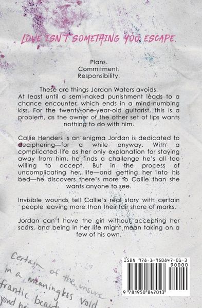 Plans.Commitment.Responsibility.These are things Jordan Waters avoids. At least until a semi-naked punishment leads to a chance encounter, which ends in a mind-numbing kiss. For the twenty-one-year-old guitarist, this is a problem, as the owner of the other set of lips wants nothing to do with him. Callie Henders is an enigma Jordan is dedicated to deciphering-for a while anyway. With a complicated life as her only explanation for staying away from him, he finds a challenge he's all too willing to accept. But in the process of uncomplicating her life-and getting her into his bed-he discovers there's more to Callie than she wants anyone to see. Invisible wounds tell Callie's real story with certain people leaving more than their fair share of marks. Jordan can't have the girl without accepting her scars, and being in her life might mean taking on a few of his own.