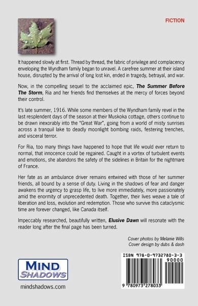 It happened slowly at first. Thread by thread, the fabric of privilege and complacency enveloping the Wyndham family began to unravel. A carefree summer at their island house, disrupted by the arrival of long lost kin, ended in tragedy, betrayal, and war. Now, in the compelling sequel to the acclaimed epic, The Summer Before The Storm, Ria and her friends find themselves at the mercy of forces beyond their control. It's late summer, 1916. While some members of the Wyndham family revel in the last resplendent days of the season at their Muskoka cottage, others continue to be drawn inexorably into the Great War, going from a world of misty sunrises across a tranquil lake to deadly moonlight bombing raids, festering trenches, and visceral terror. For Ria, too many things have happened to hope that life would ever return to normal, that innocence could be regained. Caught in a vortex of turbulent events and emotions, she abandons the safety of the sidelines in Britain for the nightmare of France. Her fate as an ambulance driver remains entwined with those of her summer friends, all bound by a sense of duty. Living in the shadows of fear and danger awakens the urgency to grasp life, to live more immediately, more passionately amid the enormity of unprecedented death. Together, their lives weave a tale of liberation and loss, evolution and redemption. Those who survive this cataclysmic time are forever changed, like Canada itself. Impeccably researched, beautifully written, Elusive Dawn will resonate with the reader long after the final page has been turned.