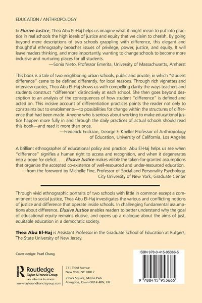 Elusive Justice addresses how educators think about and act upon, differences in schools - be they based on race, gender, class, or disability - and how discourse and practice about such differences are intimately bound up with educational justice. Rather than skip over contentious or uncomfortable dialogues about difference, Thea Abu El-Haj tackles them head on. Through rich and detailed ethnographic portraits of two schools with a commitment to social justice, she analyzes the ways discourses about difference provide a key site for both producing and resisting inequalities, and examines the dilemmas that emerge from either focusing on or ignoring them. In interrogating fundamental assumptions about difference and equity, Abu El-Haj deftly blends critique with a search for hope and possibility, to ultimately argue for ways educators might translate ideals about justice into effective practice.