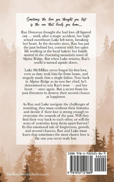 Sometimes the love you thought you lost is the one that leads you home... Rae Donovan thought she had love all figured out ... until, after a tragic accident, her high school sweetheart Luke left town, breaking her heart. In the decades since, Rae has put the past behind her, content with her quiet life working at the local bakery her family started in the charming mountain town of Alpine Ridge. But when Luke returns, Rae's world is turned upside down. Luke McMillan never forgot his first love, even as duty took him far from home, and tragedy made him a single father. Now back in Alpine Ridge as its new fire chief, he's determined to win Rae's trust - and her heart - once again. But a secret from his past threatens to destroy their second chance at happiness. As Rae and Luke navigate the challenges of reuniting, they must confront their histories and decide if their love is strong enough to overcome the wounds of the past. Will they find their way back to each other, or will the scars of yesterday keep them apart forever? In this emotional tale of forgiveness, growth, and second chances, Rae and Luke must learn that sometimes the most elusive love is the one you never truly lost.
