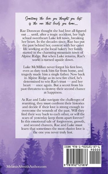 Sometimes the love you thought you lost is the one that leads you home... Rae Donovan thought she had love all figured out ... until, after a tragic accident, her high school sweetheart Luke left town, breaking her heart. In the decades since, Rae has put the past behind her, content with her quiet life working at the local bakery her family started in the charming mountain town of Alpine Ridge. But when Luke returns, Rae's world is turned upside down. Luke McMillan never forgot his first love, even as duty took him far from home, and tragedy made him a single father. Now back in Alpine Ridge as its new fire chief, he's determined to win Rae's trust - and her heart - once again. But a secret from his past threatens to destroy their second chance at happiness. As Rae and Luke navigate the challenges of reuniting, they must confront their histories and decide if their love is strong enough to overcome the wounds of the past. Will they find their way back to each other, or will the scars of yesterday keep them apart forever? In this emotional tale of forgiveness, growth, and second chances, Rae and Luke must learn that sometimes the most elusive love is the one you never truly lost.