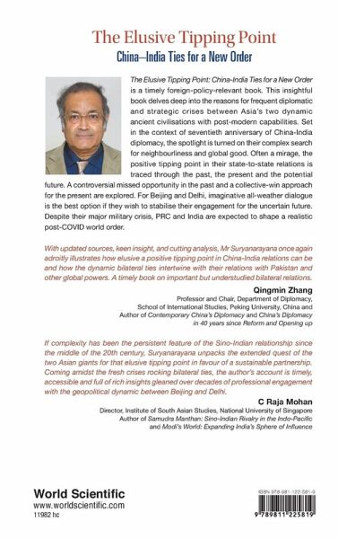 The Elusive Tipping Point: China-India Ties for a New Order is a timely foreign-policy-relevant book. This insightful book delves deep into the reasons for frequent diplomatic and strategic crises between Asia's two dynamic ancient civilisations with post-modern capabilities. Set in the context of seventieth anniversary of China-India diplomacy, the spotlight is turned on their complex search for neighbourliness and global good. Often a mirage, the positive tipping point in their state-to-state relations is traced through the past, the present and the potential future. A controversial missed opportunity in the past and a collective-win approach for the present are explored. For Beijing and Delhi, imaginative all-weather dialogue is the best option if they wish to stabilise their engagement for the uncertain future. Despite their major military crisis, PRC and India are expected to shape a realistic post-COVID world order.