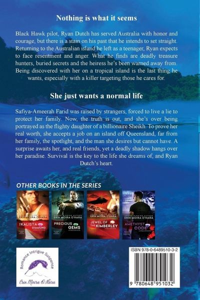 Nothing is what it seems Black Hawk pilot, Ryan Dutch has served Australia with honor and courage, but there is a stain on his past that he intends to set straight. Returning to the Australian island he left as a teenager, Ryan expects to face resentment and anger. What he finds are deadly treasure hunters, buried secrets and the heiress he's been warned away from. Being discovered with her on a tropical island is the last thing he wants, especially with a killer targeting those he cares for. She just wants a normal life Safiya-Ameerah Farid was raised by strangers, forced to live a lie to protect her family. Now, the truth is out, and she's over being portrayed as the flighty daughter of a billionaire Sheikh. To prove her real worth, she accepts a job on an island off Queensland, far from her family, the spotlight, and the man she desires but cannot have. A surprise awaits her, and real friends, yet a deadly shadow hangs over her paradise. Survival is the key to the life she dreams of, and Ryan Dutch's heart.