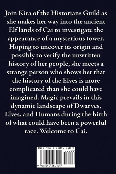 Join Kira of the Historians Guild as she makes her way into the ancient Elf lands of Cai to investigate the appearance of a mysterious tower. Hoping to uncover its origin and possibly to verify the unwritten history of her people, she meets a strange person who shows her that the history of the Elves is more complicated than she could have imagined. Magic prevails in this dynamic landscape of Dwarves, Elves, and Humans during the birth of what could have been a powerful race. Welcome to Cai.