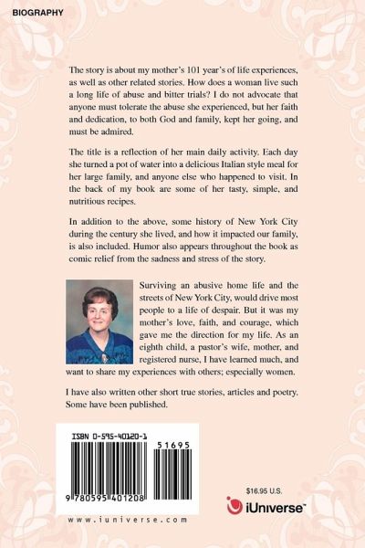 The story is about my mother's 101 year's of life experiences, as well as other related stories. How does a woman live such a long life of abuse and bitter trials? I do not advocate that anyone must tolerate the abuse she experienced, but her faith and dedication, to both God and family, kept her going, and must be admired. The title is a reflection of her main daily activity. Each day she turned a pot of water into a delicious Italian style meal for her large family, and anyone else who happened to visit. In the back of my book are some of her tasty, simple, and nutritious recipes. In addition to the above, some history of New York City during the century she lived, and how it impacted our family, is also included. Humor also appears throughout the book as comic relief from the sadness and stress of the story.