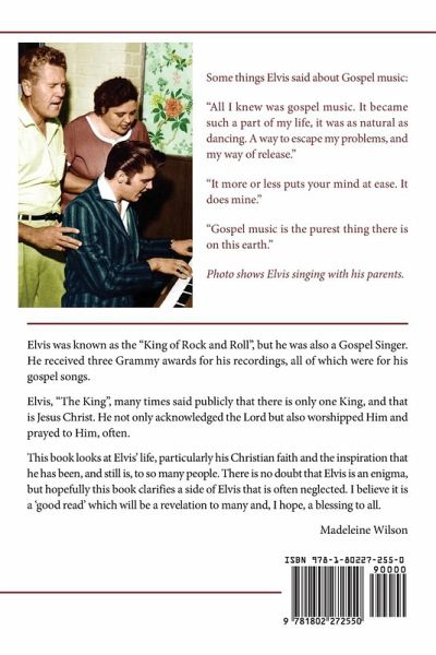Elvis was known as the "King of Rock and Roll", but he was also a Gospel Singer. He received three Grammy awards for his recordings, all of which were for his gospel songs. Elvis, "The King", many times said publicly that there is only one King, and that is Jesus Christ. He not only acknowledged the Lord but also worshipped Him and prayed to Him, often. This book looks at Elvis' life, particularly his Christian faith and the inspiration that he has been, and still is, to so many people. There is no doubt that Elvis is an enigma, but hopefully this book clarifies a side of Elvis that is often neglected. I believe it is a 'good read' which will be a revelation to many and, I hope, a blessing to all. ( Madeleine Wilson - Author) The book has a "Gallery" at the end of each chapter which has photos of Elvis, covering many aspects of his life.