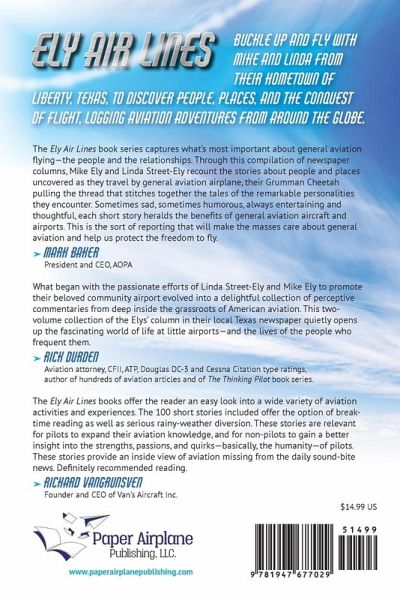 Ely Air Lines is a 2-volume set of 100 stories from the first 10 years of a weekly column by Mike and Linda Ely. Based in Liberty, Texas, the Elys fly and share stories from around the world. Buckle up and fly with Mike and Linda to discover amazing people, interesting places, and the conquest of flight. Since 2007, readers have enjoyed engaging articles weekly in the newspaper column, Ely Air Lines. Now you, too, can step aboard to enjoy a collection of stories that explore the vast realm of the flyer's world. (Volume 1 of 2)