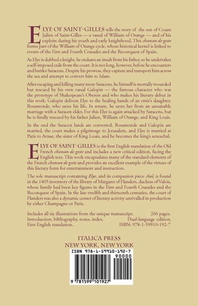 "Elye of Saint-Gilles" tells the story of Elye - the son of Count Julien of Saint-Gilles, a vassal of William of Orange - and of his exploits during his youth and early knighthood. It is part of the William of Orange cycle, whose historical kernel is linked to events of the First and Fourth Crusades and the Reconquest of Spain. As Elye is dubbed a knight, he endures an insult from his father, so he undertakes a self-imposed exile from the court. It is not long, however, before he encounters and battles Saracens. Despite his prowess, they capture and transport him across the sea and attempt to convert him to Islam. After escaping and killing many more Saracens, he himself is mortally wounded but rescued by his own vassal Galopin - the famous character who was the prototype of Shakespeare's Oberon and who makes his literary debut in this work. Galopin delivers Elye to the healing hands of an emir's daughter, Rosamonde, who saves his life. In return, he saves her from an unsuitable marriage with a Saracen elder. For this Elye is again attacked by Saracens, but he is finally rescued by his father Julien, William of Orange, and King Louis. In the end the Saracen lands are converted, Rosamonde and Galopin are married, all make a pilgrimage to Jerusalem, and Elye is married at Paris to Avisse, the sister of King Louis, and he becomes the king's seneschal. Elye of Saint-Gilles is the first English translation of the Old French chanson de geste and includes a new critical edition, facing the English text. This work encapsulates many of the standard elements of the French chanson de geste and provides an excellent example of the virtues of this literary form for entertainment and instruction. The sole manuscript containing "Elye," and its companion piece "Aiol," is found in the 1405 inventory of the library of Margaret of Flanders, duchess of Valois, whose family had been key figures in the First and Fourth Crusades and the Reconquest of Spain. In the late twelfth and thirteenth centuries, the court of Flanders was also a dynamic center of literary activity unrivalled in production by either Champagne or Paris. Dual-language edition. First English translation. Introduction, bibliography, notes, index.