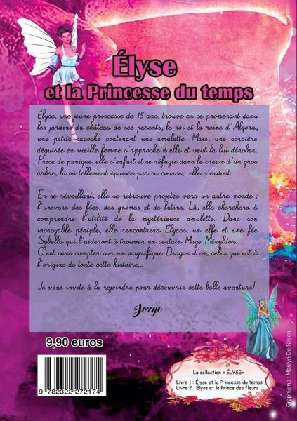 Elyse jeune princesse de 15 ans, trouve en se promenant dans les jardins du château de ses parents le roi et la reine d'Algora, une petite sacoche contenant une amulette. Mais une sorcière déguisée en vieille femme s'approche d'elle et veut lui dérober. Prise de panique elle s'enfuit et se réfugie dans le creux d'un gros arbre, la ou tellement épuisée par sa course, qu'elle s'endort.En se réveillant elle se retrouve projetée dans un autre monde, l'univers des fées, des gnomes et des lutins. La elle cherchera à comprendre l'utilité de cette mystérieuse amulette. Dans son incroyable périple, elle rencontrera Elyass, un elfe et une fée Sybella qui l'aideront à retrouver un certain mage Méryldor.C'est dans compter sur un magnifique dragon d'Or, celui qui est à l'origine de toute cette histoire.Je vous invite à la rejoindre pour découvrir cette belle aventure.