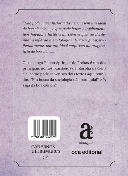 Cadernos Ultramares seeks to present Brazilian culture and thought in a qualified way, through volumes bringing together important essays by renowned authors in different areas of knowledge. Sociologist Renan Springer de Freitas is one of the main Brazilian names in the philosophy of science, as can be seen in the two texts gathered here, "In search of non-parochial sociology" and "The saga of good science".