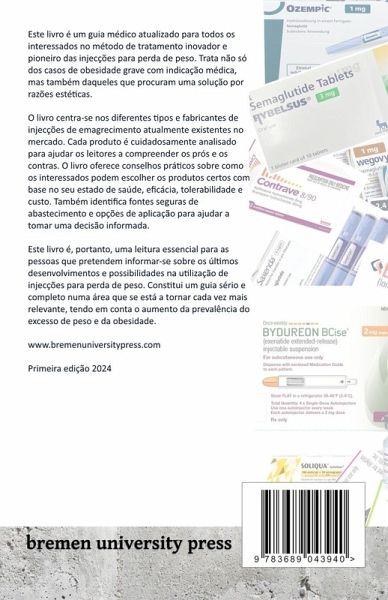 Emagrecimento por injeção: Um guia médico para injecções de perda de peso Este livro é um guia médico atualizado para todos os interessados no método de tratamento inovador e pioneiro das injecções para perda de peso. Abrange não só os casos de obesidade grave com indicação médica, mas também aqueles que procuram uma solução por razões estéticas. O livro centra-se nos diferentes tipos e fabricantes de injecções de emagrecimento atualmente existentes no mercado. Cada produto é cuidadosamente analisado para ajudar os leitores a compreender os prós e os contras. O livro oferece conselhos práticos sobre como os interessados podem escolher os produtos certos com base no seu estado de saúde, eficácia, tolerabilidade e custo. Também identifica fontes seguras de abastecimento e opções de aplicação para ajudar a tomar uma decisão informada. Um outro capítulo é dedicado aos estudos clínicos e aos efeitos a longo prazo, bem como aos riscos e efeitos secundários das injecções para perda de peso. Esta apresentação transparente ajuda os leitores a compreender e a ponderar as possíveis consequências do tratamento. Por último, o livro apresenta uma perspetiva dos futuros medicamentos promissores que estão atualmente a ser investigados. Este capítulo esclarece como o desenvolvimento destes medicamentos irá revolucionar o tratamento da obesidade e a medicina estética. Este livro é, portanto, uma leitura essencial para os doentes que pretendem informar-se sobre os últimos desenvolvimentos e possibilidades na utilização de injecções para perda de peso. Trata-se de um guia sério e completo numa área que se está a tornar cada vez mais relevante à medida que a prevalência do excesso de peso e da obesidade aumenta.