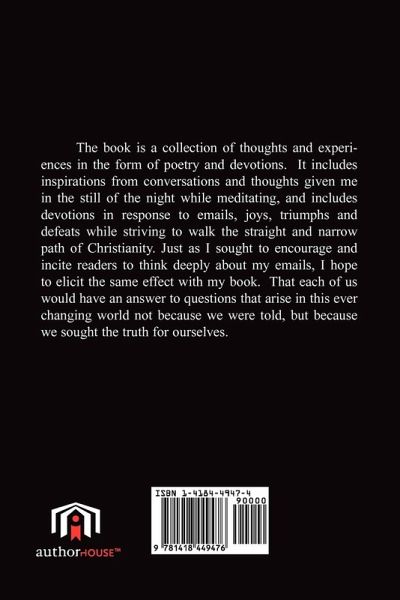 The book is a collection of thoughts and experiences in the form of poetry and devotions. It includes inspirations from conversations and thoughts given me in the still of the night while meditating, and includes devotions in response to emails, joys, triumphs and defeats while striving to walk the straight and narrow path of Christianity. Just as I sought to encourage and incite readers to think deeply about my emails, I hope to elicit the same effect with my book. That each of us would have an answer to questions that arise in this ever changing world not because we were told, but because we sought the truth for ourselves.