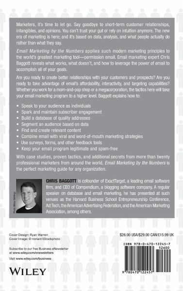 "Baggott's wonderful new direct marketing book is loaded with practical advice and recommendations from some of the best minds in the industry. Email Marketing by the Numbers should be read by everyone in the industry who wants to profit from acquiring and retaining customers." - Arthur Middleton Hughes, Vice President/Solutions Architect, Knowledge Base Marketing, and author of Strategic Database Marketing