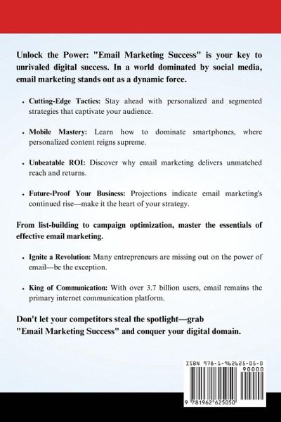 Unlock the Power: "Email Marketing Success" is your key to unrivaled digital success. In a world dominated by social media, email marketing stands out as a dynamic force. Cutting-Edge Tactics: Stay ahead with personalized and segmented strategies that captivate your audience. Mobile Mastery: Learn how to dominate smartphones, where personalized content reigns supreme. Unbeatable ROI: Discover why email marketing delivers unmatched reach and returns. Future-Proof Your Business: Projections indicate email marketing's continued rise-make it the heart of your strategy. From list-building to campaign optimization, master the essentials of effective email marketing. Ignite a Revolution: Many entrepreneurs are missing out on the power of email-be the exception. King of Communication: With over 3.7 billion users, email remains the primary Internet communication platform. Don't let your competitors steal the spotlight-grab "Email Marketing Success" and conquer your digital domain.