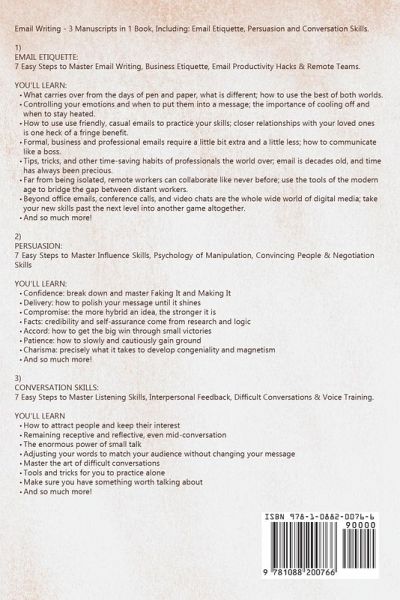 Email Writing - 3 Manuscripts in 1 Book, Including: Email Etiquette, Persuasion and Conversation Skills. 1) EMAIL ETIQUETTE: 7 Easy Steps to Master Email Writing, Business Etiquette, Email Productivity Hacks & Remote Teams. YOU'LL LEARN: · What carries over from the days of pen and paper, what is different; how to use the best of both worlds. · Controlling your emotions and when to put them into a message; the importance of cooling off and when to stay heated. · How to use use friendly, casual emails to practice your skills; closer relationships with your loved ones is one heck of a fringe benefit. · Formal, business and professional emails require a little bit extra and a little less; how to communicate like a boss. · Tips, tricks, and other time-saving habits of professionals the world over; email is decades old, and time has always been precious. · Beyond office emails, conference calls, and video chats are the whole wide world of digital media. · And so much more! 2) PERSUASION: 7 Easy Steps to Master Influence Skills, Psychology of Manipulation, Convincing People & Negotiation Skills YOU'LL LEARN: ¿ Confidence: break down and master Faking It and Making It ¿ Delivery: how to polish your message until it shines ¿ Compromise: the more hybrid an idea, the stronger it is ¿ Facts: credibility and self-assurance come from research and logic ¿ Accord: how to get the big win through small victories ¿ Patience: how to slowly and cautiously gain ground ¿ Charisma: precisely what it takes to develop congeniality and magnetism ¿ And so much more! 3) CONVERSATION SKILLS: 7 Easy Steps to Master Listening Skills, Interpersonal Feedback, Difficult Conversations & Voice Training. YOU'LL LEARNHow to attract people and keep their interest Remaining receptive and reflective, even mid-conversation The enormous power of small talk Adjusting your words to match your audience without changing your message Master the art of difficult conversations Tools and tricks for you to practice alone Make sure you have something worth talking about And so much more!