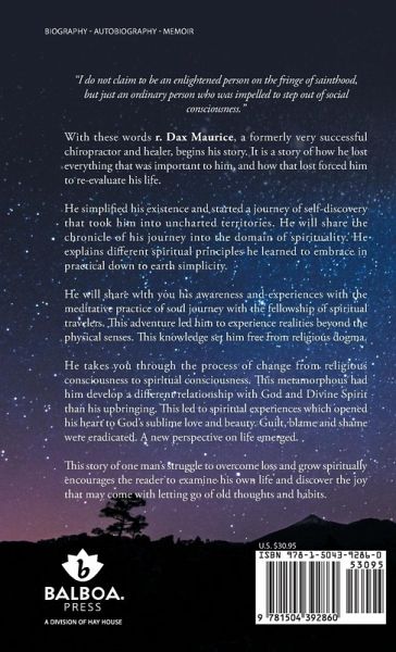 I do not claim to be an enlightened person on the fringe of sainthood, but just an ordinary person who was impelled to step out of social consciousness. With these words r. Dax Maurice, a formerly very successful chiropractor and healer, begins his story. It is a story of how he lost everything that was important to him, and how that lost forced him to re-evaluate his life. He simplified his existence and started a journey of self-discovery that took him into uncharted territories. He will share the chronicle of his journey into the domain of spirituality. He explains different spiritual principles he learned to embrace in practical down to earth simplicity. He will share with you his awareness and experiences with the meditative practice of soul journey with the fellowship of spiritual travelers. This adventure led him to experience realities beyond the physical senses. This knowledge set him free from religious dogma. He takes you through the process of change from religious consciousness to spiritual consciousness. This metamorphous had him develop a different relationship with God and Divine Spirit than his upbringing. This led to spiritual experiences which opened his heart to Gods sublime love and beauty. Guilt, blame and shame were eradicated. A new perspective on life emerged. This story of one mans struggle to overcome loss and grow spiritually encourages the reader to examine his own life and discover the joy that may come with letting go of old thoughts and habits.