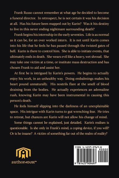 There is no hard evidence to tell us when Franky Russo''s young mind turned toward the decision to select a career in the funeral business, or if he actually even consciously made the decision to pursue that livelihood. Perhaps he was groomed for that position by unknown forces. In any case, Franky''s dreams came true, and along with the dreams came the nightmares of an unexplainable existence on this earth. The characters and stories in this book represent nothing less than human desperation-an attempt to create some sort reasonable rationalization for what really happened. Still, some things cannot be explained, only detailed. What happened to Franky during his career in the funeral industry is something that most people would not wish on their worst enemy. One may finish this book with a myriad of emotions, such as laughing hysterically or crying like a baby and in the end with shivers running up and down their spine. The irony of this book is that it has a way of showing how one deals with the everyday frustrations of the embalmer/funeral director, although I don''t think Franky ever really accomplished that.