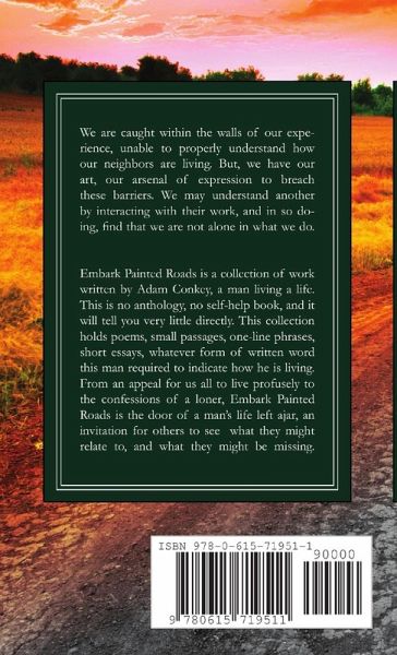 We are caught within the walls of our experience, unable to properly understand how our neighbors are living. But, we have our art, our arsenal of expression to breach these barriers. We may understand another by interacting with their work, and in so doing, find that we are not alone in what we do. Embark Painted Roads is a collection of work written by Adam Conkey, a man living a life. This is no anthology, no self-help book, and it will tell you very little directly. This collection holds poems, small passages, one-line phrases, short essays, whatever form of written word this man required to indicate how he is living. From an appeal for us all to live profusely to the confessions of a loner, Embark Painted Roads is the door of a man's life left ajar, an invitation for others to see what they might relate to, and what they might be missing.