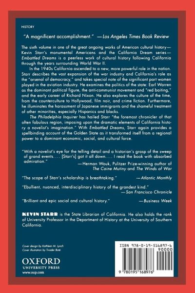 The sixth volume in one of the great ongoing works of American cultural history--the monumental Americans and the California Dream series--"Embattled Dreams is a peerless work of cultural history following California i n the years surrounding World War II. During the 1940s California ascended to a new, more powerful role in the nation. Starr describes the vast expansion of the war industry and California's role as the "arsenal of democracy" (especially the significant part women played in the aviation industry). He examines the politics of the state: Earl Warren as the dominant political figure, the anti-Communist movement and "red baiting," and the early career of Richard Nixon. He also looks at culture, ranging from Hollywood to the counterculture, to film noir and detective stories. And he illuminates the harassment of Japanese immigrants and the shameful treatment of other minorities, especially Hispanics and blacks.