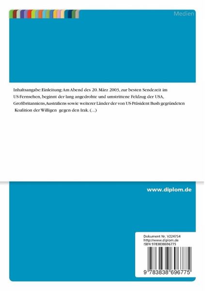 Panzer und Militärfahrzeuge rücken von Kuwait aus in den Irak vor - ihr Ziel: die Hauptstadt Bagdad - ihre Mission: der Sturz des irakischen Diktators Saddam Hussein, der verdächtigt wird, im Besitz von gefährlichen Massenvernichtungswaffen zu sein. Raketen werden abgeschossen, Bomben aus Kampfflugzeugen abgeworfen, irakische Panzer explodieren, irakische Soldaten schwenken die weiße Fahne und knien mit hinter dem Kopf verschränkten Armen vor den Koalitionssoldaten nieder. Der Fernsehzuschauer ist bei all diesen Ereignissen live dabei, mitten im Geschehen sozusagen. Krieg bestimmt den Fernsehalltag der nächsten sechs Wochen auf allen Kanälen. Fast alle großen Fernsehstationen rund um den Globus sind bei diesem Medienspektakel hautnah dabei - von CNN, Fox News, BBC, Sky News, RTL, SAT.1, n24, ARD und ZDF bis hin zu den arabischen Fernsehsendern Al Dschasira, Al Arabija, Abu Dhabi TV, die erstmals im Irak-Krieg 2003 eine ernstzunehmende Konkurrenz für die westlichen Medien darstellen und eine völlig verschiedene Sichtweise des Krieges präsentieren. Die Nachrichtenmedien berichten pausenlos. Soviel Informationen wie in diesem Krieg hatten die Zuschauer in keinem Krieg zuvor zu verarbeiten.