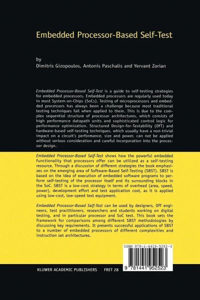 Embedded Processor-Based Self-Test shows how the powerful embedded functionality that processors offer can be utilized as a self-testing resource. Through a discussion of different strategies the book emphasizes on the emerging area of Software-Based Self-Testing (SBST). SBST is based on the idea of execution of embedded software programs to perform self-testing of the processor itself and its surrounding blocks in the SoC. SBST is a low-cost strategy in terms of overhead (area, speed, power), development effort and test application cost, as it is applied using low-cost, low-speed test equipment.