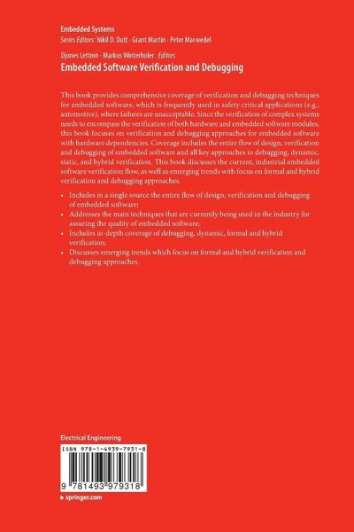 This book provides comprehensive coverage of verification and debugging techniques for embedded software, which is frequently used in safety critical applications (e.g., automotive), where failures are unacceptable. Since the verification of complex systems needs to encompass the verification of both hardware and embedded software modules, this book focuses on verification and debugging approaches for embedded software with hardware dependencies. Coverage includes the entire flow of design, verification and debugging of embedded software and all key approaches to debugging, dynamic, static, and hybrid verification. This book discusses the current, industrial embedded software verification flow, as well as emerging trends with focus on formal and hybrid verification and debugging approaches.