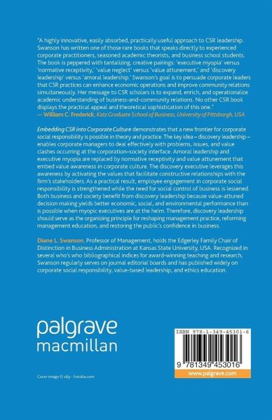"A highly innovative, easily absorbed, practically useful approach to CSR leadership. Swanson has written one of those rare books that speaks directly to experienced corporate practitioners, seasoned academic theorists, and business school students. The book is peppered with tantalizing, creative pairings: 'executive myopia' versus 'normative receptivity,' 'value neglect' versus 'value attunement,' and 'discovery leadership versus amoral leadership.' Swanson's goal is to persuade corporate leaders that CSR practices can enhance economic operations and improve community relations simultaneously. Her message to CSR scholars is to expand, enrich, and operationalize academic understanding of business-and-community relations. No other CSR book displays the practical appeal and theoretical sophistication of this one." - William C. Frederick, Katz Graduate School of Business, University of Pittsburgh, USA