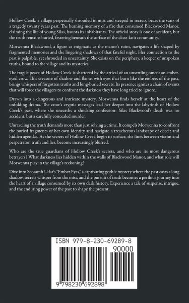 Hollow Creek, a village perpetually shrouded in mist and steeped in secrets, bears the scars of a tragedy twenty years past. The burning memory of a fire that consumed Blackwood Manor, claiming the life of young Silas, haunts its inhabitants. The official story is one of accident, but the truth remains buried, festering beneath the surface of the close-knit community. Morwenna Blackwood, a figure as enigmatic as the manor's ruins, navigates a life shaped by fragmented memories and the lingering shadows of that fateful night. Her connection to the past is palpable, yet shrouded in uncertainty. She exists on the periphery, a keeper of unspoken truths, bound to the village and its mysteries. The fragile peace of Hollow Creek is shattered by the arrival of an unsettling omen: an ember-eyed crow. This creature of shadow and flame, with eyes that burn like the embers of the past, brings whispers of forgotten truths and long-buried secrets. Its presence ignites a chain of events that will force the villagers to confront the darkness they have long tried to ignore. Drawn into a dangerous and intricate mystery, Morwenna finds herself at the heart of the unfolding drama. The crow's cryptic messages lead her deeper into the labyrinth of Hollow Creek's past, where she unearths a shocking confession: Silas Blackwood's death was no accident, but a carefully concealed murder. Unraveling the truth demands more than just solving a crime. It compels Morwenna to confront the buried fragments of her own identity and navigate a treacherous landscape of deceit and hidden agendas. As the secrets of Hollow Creek begin to surface, the lines between victim and perpetrator, truth and lies, become increasingly blurred. Who are the true guardians of Hollow Creek's secrets, and who are its most dangerous betrayers? What darkness lies hidden within the walls of Blackwood Manor, and what role will Morwenna play in the village's reckoning? Dive into Seosamh Udar's "Ember Eyes," a captivating gothic mystery where the past casts a long shadow, secrets whisper from the mist, and the pursuit of truth becomes a perilous journey into the heart of a village consumed by its own dark history. Experience a tale of suspense, intrigue, and the enduring power of the past to shape the present.
